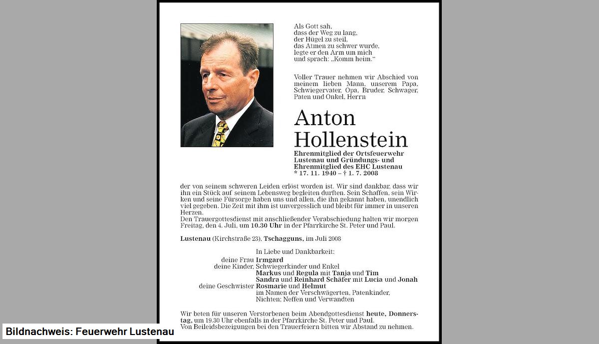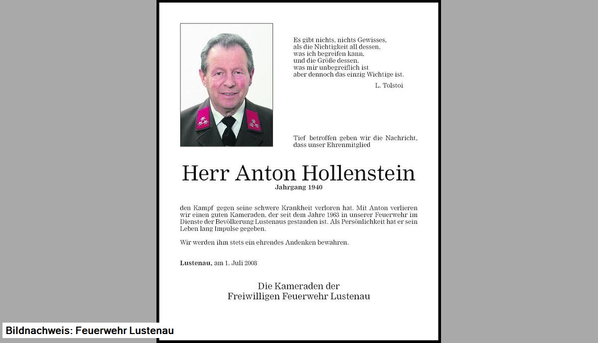Unser Ehrenmitglied, Herr Anton Hollenstein, wurde gestern Nachmittag vom Schöpfer nach langer, geduldig ertragener, Krankheit von dieser Welt abberufen.
