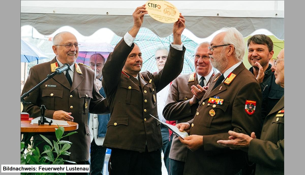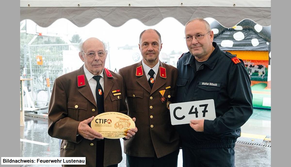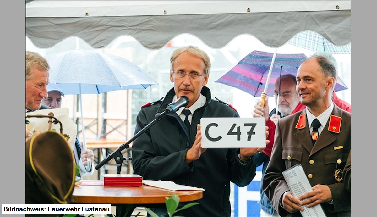 Peter Krumhaar, Feuerwehrhistoriker NÖ, lies die ersten Kontakte im November 2008 Revue passieren, gratulierte der Feuerwehr Lustenau zur vollbrachten Leistung und überreichte ein Replikat des ersten Kennzeichen "C 47" des Fahrzeuges.
