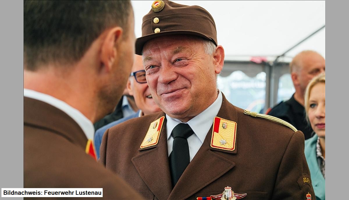 Landesfeuerwehrinspektor Hubert Vetter übernahm in seiner Laudatio die Verleihung des Verdienstzeichens der 3. Stufe des Österreichischen Bundesfeuerwehrverbandes an Hartwig Sturm, welcher diese Stellvertretend für alle die am Projekt „Wiederherstellung Austro Fiat, Bj. 1926" mitgeholfen hatten, entgegen nahm.