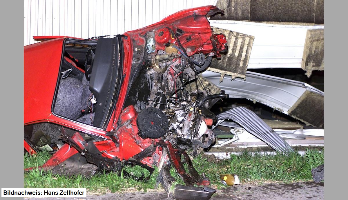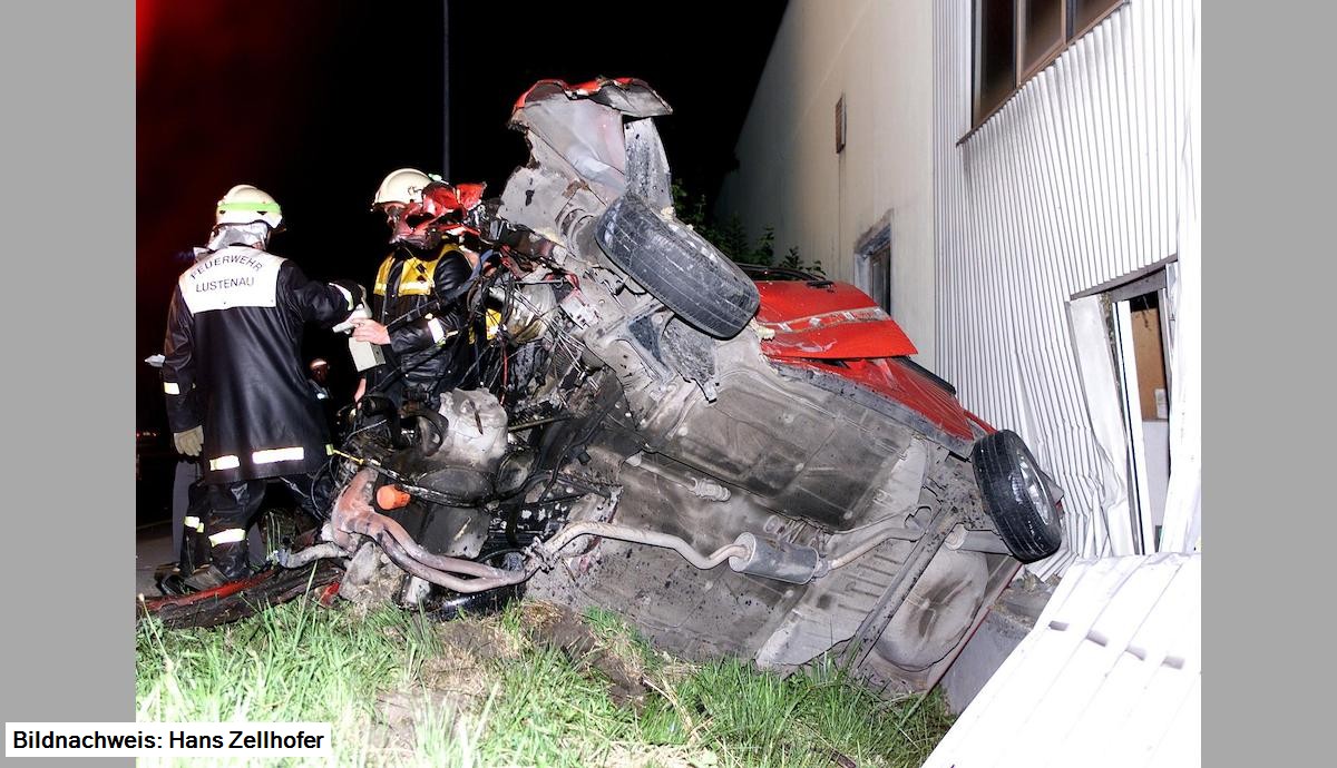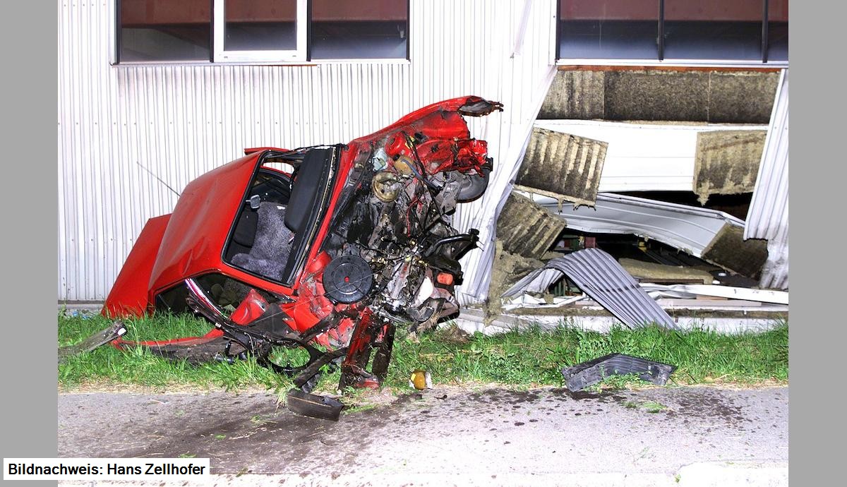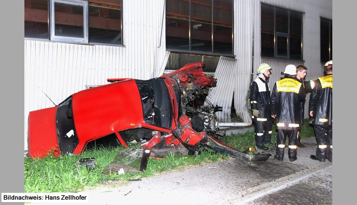 PKW, Marke Opel Ascona, kommt aufgrund überhöhter Geschwindigkeit, nach der Kreuzung Hagstraße/Bruggerstraße Richtung Ortsmitte ins Schleudern, geriet nach rechts und prallte in die Fabriksmauer der Fa. Fulterer, welche aufgerissen wurde. Am Fahrzeug entstand Totalschaden.