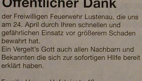 Eine Explosion mit anschließendem Großbrand zerstörte am 21.10.1996 gegen 12:30 Uhr die Firma Stereoprint AG im benachbarten Au in der Schweiz. Die Detonation war so stark, dass auch bei benachbarten Gebäuden zahlreiche Scheiben zu Bruch gingen. Zwei Firmenangestellte wurden schwer verletzt und konnten sich nur durch einen Sprung in den naheliegenden Auer Binnenkanal retten. Der Sachschaden beläuft sich auf über 16 Millionen Schilling. Die Löscharbeiten gestalteten sich durch die in der Firma befindlichen Chemikalien (Magnesium, Methylalkohol) schwierig. Die Feuerwehr Lustenau unterstützte die Schweizer Kameraden mit vier Fahrzeugen bei der Brandbekämpfung.