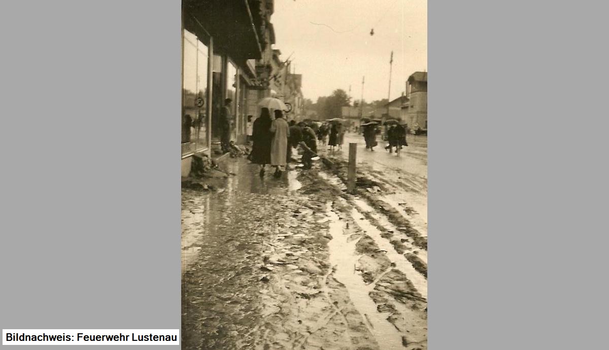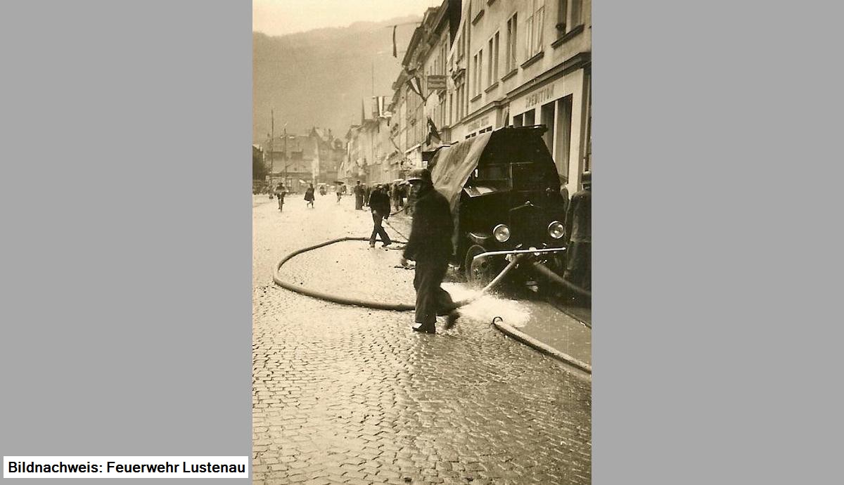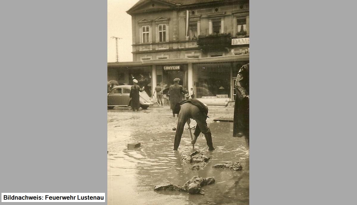 Auszug aus dem Original-Protokoll der Verhandlungsschrift über die am Freitag, den 24. September 1954, um 8 h abends bei Kamerad Rudi Knapp abgehaltene Wehrausschuß-Sitzung unter dem Vorsitz des Kommandanten Gebhard Fitz. Um 12 h nachts wird Kommandant Fitz vom Bürgermeister Bösch verständigt, daß der Rhein sehr stark im Steigen begriffen sei und eine akute Hochwassergefahr zu befürchten sei. Gleich danach begab sich der Kommandant auf den Weg, weckte noch einige Wehrmänner und begab sich an den Strom. Um 1 h nachts war das Wasser noch ca ½ m unter dem neu errichteten Dämmen. In der Folge stiegen die reißenden Fluten, die selten einmal soviel Holz mit sich trugen, stetig an. Um 5 Uhr früh mußte Alarm gegeben werden. Die nun erschienenen Wasserwehrmänner wurden an den verschiedensten Orten engesetzt. Bei der Rheindorfer- und Oberfahrbrücke mußten die Dammabsperrbalken eingelegt werden, Sandsäcke aufgefüllt und dazwischengelegt werden. Sehr schwierig gestalteten sich die Arbeiten an der Eisenbahnbrücke, wo eine Dammlucke geschlossen werden mußte. Um 11 h mittags hatte das Wasser seinen höchsten Stand erreicht, einen Stand wie ihn der Strom noch nie zuvor aufwies. Das ziemlich rasche Sinken verminderte immer mehr die große Gefahr und abends um ½ 6 Uhr konnte die Wasserwehr einrücken. Viele Wehrmänner waren bis dahin pausenlos im Einsatz gestanden, trotzdem sie von rieselnden Regen schon früh durchnäßt waren. Namens des Landesfeuerwehrverbandes dankte Landesfeuerwehrinspektor Mittenpergher in einem zur Verlesung gebrachten Rundschreiben den entlang des ganzen Stromes im Einsatz gestandenen Wehrmännern, die durch ihre schwere Arbeit tatkräftigst mitgeholfen haben, einen Teil unserer Heimat von unabsehbaren Schaden zu bewahren. Auch Bürgermeister Josef Bösch sprach von der Gemeindevertretung der Wehr den Dank aus. 65 Mann ~ 1035 Stunden. Auszug aus dem Original-Protokoll der Verhandlungsschrift über die Dienstag, den 5. Oktober 1954, im Anschluß an die Nachtalarmübung abgehaltene Wehrversammlung im Gasthaus zum Bräuhaus, unter dem Vorsitz des Kommandanten Gebhard Fitz. „..Wehe wenn sie losgelassen, wachsen ohne Widerstand“. Diese Worte Schillers sind wohl bestens zutreffend für das Hochwasser des Rheins am 22. August 1954. Kommandant Fitz erhielt bereits in der Nacht um 12 Uhr mitgeteilt, daß der Strom in stetigen Steigen sei und höchstwahrscheinlich einen Hochwasserstand erreichen werde, wie es in den letzten 25 Jahren nicht mehr der Fall war. Sofort begab sich der Vorsitzende mit einigen Kameraden zu den beiden Rheinbrücken beim Oberfahr und im Rheindorf, um dort die Joche vor anstauenden Holze zu befreien. Um 1 Uhr nachts war das Wasser noch zirka einen halben Meter unter der Krone der neuerrichteten Dämme. Doch fortdauernd fiel der Regen, und immer weiter wuchs der Rhein, Unmengen von Holz mit sich reißend. Des Morgens um 5 Uhr früh kam der Befehl, daß die gesamte Wasserwehr in Aktion zu treten habe. Nun wurden an den beiden Brücken die Dammabsperrbalken eingelegt, Sandsäcke aufgefüllt und dazwischengebettet. Um ca. 10 Uhr begann das Wasser die Höhe der Straße beim Oberfahr zu erreichen, und ohne die Abriegelung mittels der Sandsäcke wäre es an dieser Stelle in die Gemeinde eingedrungen. Um 11 Uhr hatte der Strom seinen höchste Stand erreicht, einen Hochwasserstand, den der Rhein nie zuvor einmal aufzuweisen hatte. Zum Glück fiel dann das Wasser ziemlich rasch und so war nachmittags die größte Gefahr gebannt. Unsere Wehr hat über dieses Hochwasser mehr als 1000 Einsatzstunden geleistet, vornehmlich an der Oberfahr- und Eisenbahnbrücke, wo die Wehrmänner Sandsäcke über die ganze Brücke hinübertragen mußten, um eine Einbruchstelle zu schließen. Abschließend müssen wir Gott danken, daß wir um Haaresbreite an einer unübersehbaren Katastrophe vorübergingen. Es war für uns ein großes Glück, dass Ill und Frutz kein Hochwasser führten, daß die Holzbrücken, denen man nie viel Vertrauen entgegenbrachte, einem so ungeheuren Drucke standhielten und nicht in sich zusammenbrachen und so eine Stauung verursachten. Trotzdem hätten aber diese beiden glücklichen Umstände nicht ausgereicht, wenn nicht vor einem guten Jahrzent die Dämme verstärkt und erhöht worden wären. Kommandant Fitz dankte allen Wehrmännern für den aufopferungsvollen Einsatz, durch den im Zusammenwirken mit zahlreichen hilfsbereiten Zivilpersonen unsere schöne Heimatgemeinde vor einer schweren Überschwemmung verschont wurde. Gleichzeitig muss aber noch darauf hingewiesen werden, daß die Ausrüstung der Wasserwehr unzulänglich ist. Es waren zu wenig Sandsäcke lagernd, kein Sand zur Stelle und nur sehr schwer aufzutreiben, die Beleuchtung ist mehr als mangelhaft und es müßte ein Hebegerät angeschafft werden, mittels welchem man Holz vom Joch hochheben kann. Daß die Dämme nochmals erhöht werden müssen, hat uns das Hochwasser bewiesen, und so steht nur zu hoffen, daß diese geplante Arbeit bald ausgeführt wird.