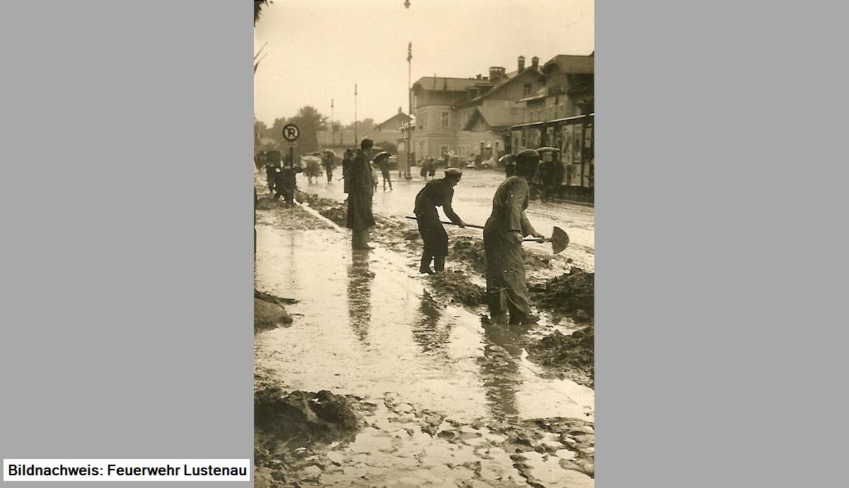 Auszug aus dem Original-Protokoll der Verhandlungsschrift über die am Donnerstag, den 22. Juli 1954, um ½ 9 Uhr abends bei Kamerad Ferdinand König stattgefundene Wehrausschußsitzung unter dem Vorsitz des Kommandanten Gebhard Fitz. b.) Der Versitzende verliest einen Bericht des Schriftführers über den Einsatz im Lawinenkatastrophengebiet Großwalsertal: Am Samstag, den 3.4.1954, begaben sich 13 Wehrmänner der Ortsfeuerwehr Lustenau unter Kommandant Fitz mittels Rüstwagen in das Lawinenkatastrophengebiet Großwalsertal. Die Fahrt ging um 6 Uhr früh von Lustenau über Feldkirch, Nenzing, Thüringerberg nach Blons. Dort wurden wir von Landesfeuerwehrinspektor Mittenbergher nach Sonntag delegiert. Um 8 Uhr zur Arbeit gekommen, waren wir in zwei Gruppen aufgeteilt, mit Aufräumungsarbeiten in der Hofstatt unterhalb der Sennerei, bzw. bei einem zusammengedrückten Wohnhaus oberhalb der Sennerei beschäftigt. Ununterbrochen rieselte Regen vom Himmel und wir waren froh des Mittags im Gasthaus Löwen essen zu können. Am Nachmittag wurde auf den alten Plätzen die Arbeit wieder aufgenommen. Um 5 Uhr abends erschien der Herr Landeshauptmann Ilg. Er selbst war auch den ganzen Tag über im Einsatz gestanden und wußte so am besten um die schwere, mühevolle Arbeit. Nachdem wir wiederum im Löwen vorzüglich gegessen hatten, wurden wir vom Bürgermeister Bichel in verschiedene Privathäuser zum schlafen aufgeteilt. Am Sonntag gings es um ½ 7 Uhr in die Kirche. Kurz gefrühstückt, begannen wir unsere Tätigkeit am eingedrückten Saale des Gasthauses zum Löwen. Nachmittags ½ 3 Uhr machten wir Feierabend und auf dem gleichen Wege ging es wieder heimwärts. Kommandant Fitz dankte allen beteiligten Wehrmännern für den rastlosen und selbstlosen Einsatz, der wirklich ganze Männer forderte. Auszug aus der Original-Abschrift der Chronik für 1954 Lawineneinsatz im Grosswalsertal! Nach den grossen Lawinenunglücken im Walsertal wurden alle Wehren von Vorarlberg zur Hilfeleistung nach dort aufgerufen. So leistete auch unsere Wehr 2 Tage mit je 13 Mann bei den Aufräumungsarbeiten. Auszug aus der Festschrift "100 Jahre Feuerwehr Lustenau" Im Katastrophengebiet Großes Walsertal waren am 3. und 4. April 1954 je 13 Mann als freiwillige Helfer bei den Aufräumungsarbeiten beschäftigt, wobei wir unter schwierigen Voraussetzungen in Blons und Sonntag schwer gearbeitet haben, und wurde uns auch seitens des Bürgermeisters von Sonntag volle Anerkennung ausgesprochen. Wer dabei war, wird bestätigen müssen, daß wir damals nicht umsonst ins Walsertal kamen.
