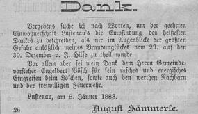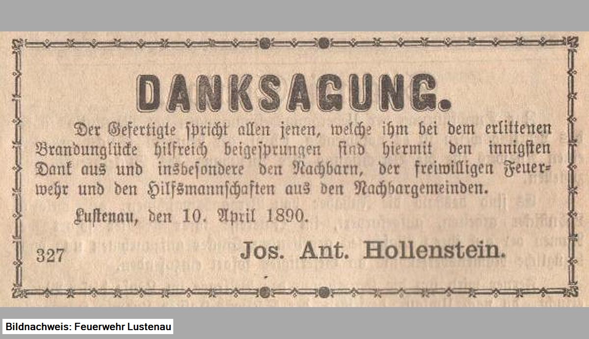 Auszug aus dem Original-Protokoll Uber die am 8 Novemb 84. im Gasthaus zum Adler abgehaltene außerordentlichen Generalversammlung welche anläßlich des letzten Brandes des Stickerei Gebäude zum Hecht nach § 10 der Vereinstatuten abgehalten wurde. I In derselben wurde über die beim letzten Brande wahrgenommenen Erfahrungen u. Mängel in ziemlich ausgedehnter Weise besprochen u. depatiert, namentlich wurde betreffs dem Mundrohrführer viel Lärm gemacht, da derselbe einige Steiger, ohne sein Verschulden naß gemacht hat. Die Mundrohrführer wurden aber danach vom H. Hptm. aufmerksam gemacht acht zu geben wo Sie das Wasser hinleiten, auch wurde vom H. Hptm. die Erfahrung gemacht daß Feuerwehrmänner oft zu hitzig u. zu waghalsig arbeiten u. könnten dadurch leicht Ihre Mitfeuerwehrmänner schädigen, wie auch bald beim letzten Brande geschehen wäre. Im ganzen genommen hat sich jedoch die Feuerwehr nach Aussage von Fachleuten sehr gut gehalten. Vorarlberger Volksblatt: 04.11.1884 Lustenau, 1. Nov. Heute Vormittag entstand Feuer in der Stickerei des Marx Bösch, Heitwirth im Rheindorf. Das war während des Gottesdienstes, als der hochwürdige Herr Pfarrer so eben die Predigt begonnen hatte. Alles wollte nun auf einmal zu den Thüren hinaus, aber der Hr. Pfarrer ermahnte die Anwesenden, vorsichtig hinauszugehen, damit kein Unglück passiere. Man that so. Auf der Unglücksstätte wurde von der Stickerei nur der Dachstuhl ein Opfer des Feuers, dagegen brannte das Gebäude, welches als Streu- und Heustadel diente, gänzlich nieder, obwohl die Feuerwehr sehr thätig eingriff.