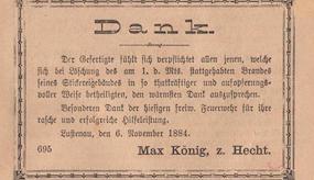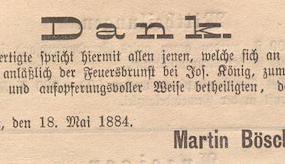 1. Ausrückung unserer Feuerwehr Inh. Josef König Auszug aus dem Original-Protokoll Über die am 17. Mai im Gasthaus zur „Krone“ abgehaltene Generalversammlung: II. Berathung u. besprechung über die bei letzten Brande am 9 Mai gemachten Erfahrungen u. Wahrnehmungen Brand Auszug aus der Kirchenchronik 1804 bis 1900 Gegen Abend des 9. Mai 1884 brannte dem Jos. König Schäflewirth, am Hag, Haus und Stadel ab. Vorarlberger Volksblatt: 09.05.1884 Lustenau, 9. Mai. Heute nachmittags 4 Uhr ist das Gasthaus „zum Schäfle“, am Hang niedergebrannt. Durch das energische Eingreifen der Lustenauer, wurden noch zwei Stickmaschinen und im Spezereiladen befindliche Waaren gerettet worden. Auch die Höchster waren mit ihrer Spritze frühzeitig erschienen. Ursache unbekannt. Vor 19 Jahren brannte an derselben Stätte ein Haus ab. tirolische vorarlbergische Brand-Versicherungsanstalt: Schadenauszahlung an Karolina und Katharina Fitz, 25 fl.
