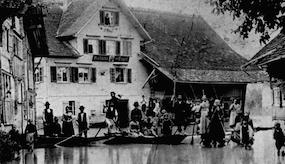 Aufbietung der Feuerwehr als 1. Aufgebot der Wasserwehr wegen stetigen Steigen des Rheins. Aufbietung der gesamten Wasserwehr - aller wehrfähigen Männer der Gemeinde, - am 10.09.1888. Trotz fast übermenschlicher Leistung kam es am 11.09.1888 zum Wassereinbruch in unsere Gemeinde. Auszug aus der Kirchenchronik Am 11. September 1888, abends halb 7 Uhr, brach der Rhein, der schon in Koblach und Mäder eingebrochen war und sich in gewaltigen Fluten über Bauern herabwälzte, bei der Seelache den Damm durch und überschwemmte die ganze Gemeinde. In zwei Strömungen floß das Wasser drei Tage lang mehrere Fuß hoch, in der einen Strömung, die über das Binsenfeld und den Stalden ging, sogar 6 Tage lang durch Lustenau. Der Schaden ist kaum abzuschätzen, denn außer den Feldfrüchten, die vernichtet wurden, und den „Schollen“, die alle davonschwammen, kamen Stickmaschinen und Hausgräte zu Schaden und es wurde an Arbeit viel versäumt. Der Damm and er Seelache wurde so schnell wie möglich durch eine Bretterwand geschlossen und mit Steinen und Erde wieder ausgebessert. Am 5. Oktober desselben Jahres gab es aber eine zweite Überschwemmung, welche den neuerstellten Damm wegfegte und wieder die Hälfte des Lustenauer Bodens unter Wasser setzte. Alp, Gründel, Binsenfeld und Stalden kamen wieder ganz unter Wasser. Der Schaden betrug in Lustenau alleine ca. 300.000 Gilden.