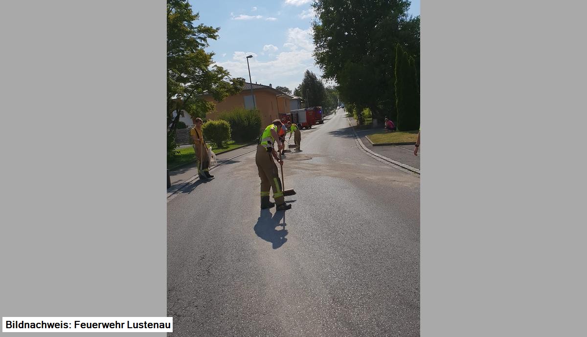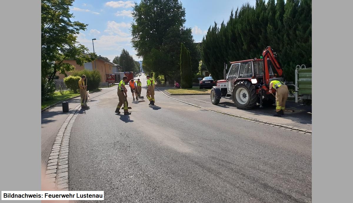 Tätigkeit am Einsatzort: Binden der ausgelaufenen Betriebsstoffe und Reinigung der Fahrbahn