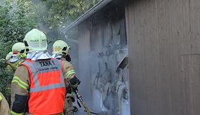 Brand eines Schuppens - Ablöschen des Brandes unter Atemschutz. Im Einsatz: ELF, Tank 1, LF 1, DL 30, Rüst 1, Polizei Lustenau, 1 First Responder