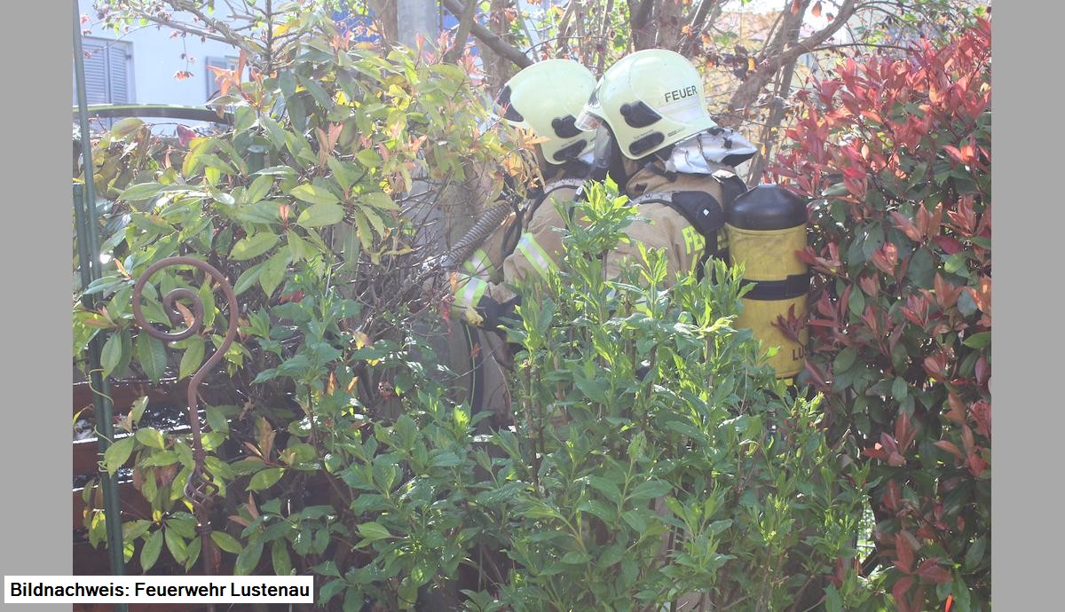 Situation bei Ankunft: Brand eines Komposthaufens, Ablöscharbeiten durch anwesenden Besitzer und einem benachbarten Feuerwehrmann mit Gartenschlauch bereits eingeleitet.