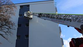 Einstieg mittels Drehleiter über Fenster in das 4. OG in die Wohnung, Öffnung der Türe und Übergabe des Patienten an das Rote Kreuz Im Einsatz: ELF. Rüst 1, Leiter, Tank 3, Rotes Kreuz, Polizei AS