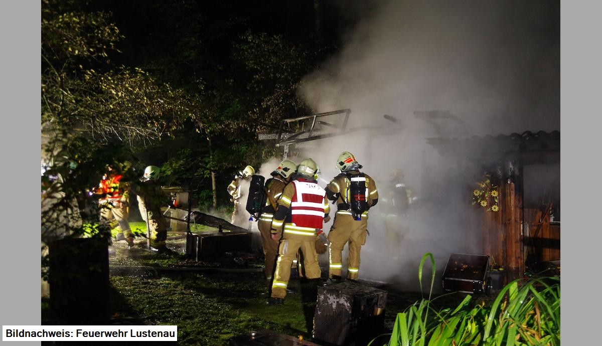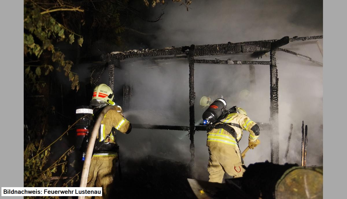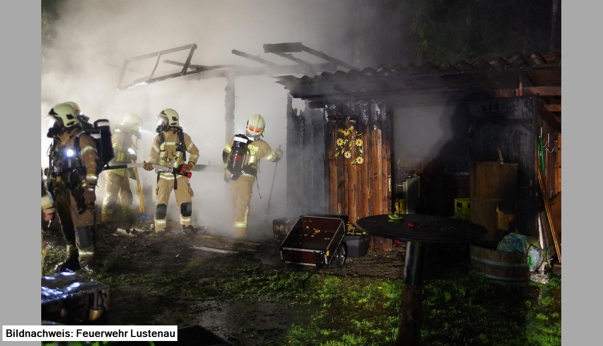 Tätigkeit am Einsatzort: Löschen der Riedhütte unter Atemschutz, Entfernung von drei Gasflaschen, Erstellung Wasserversorgung, Ausleuchtung der Einsatzstelle