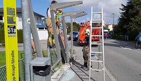 Situation bei Ankunft: Beschädigte Bushaltestelle - Glasplatten drohen herunterzufallen Tätigkeit am Einsatzort: Teildemontage der Bushaltestelle, Sicherungsarbeiten - Bergung der Glasplatten, Reinigung und Absperrung der Haltestelle Im Einsatz: Rüst 1, Rüst 2, Polizei AS