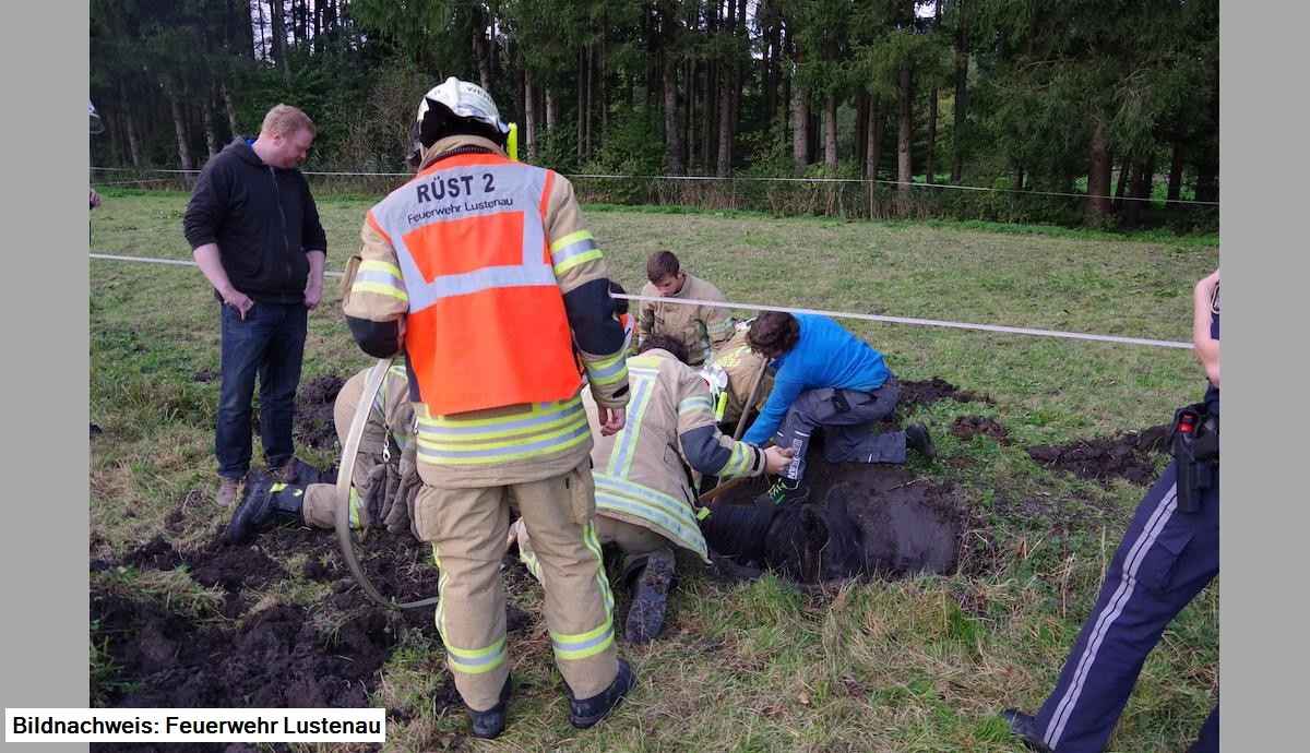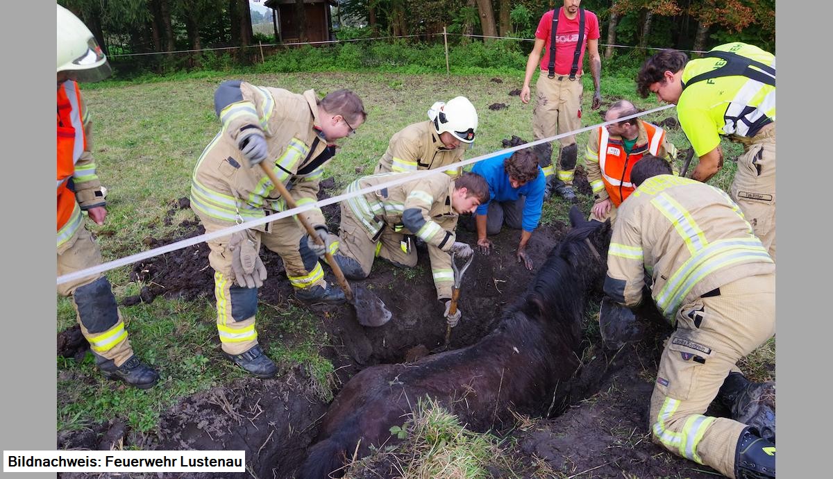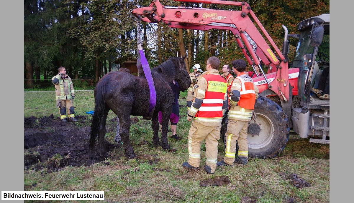 Tätigkeit am Einsatzort: Abgraben des Riedgrabens und Rettung des Pferdes unter Einsatz von zwei Frontladern.