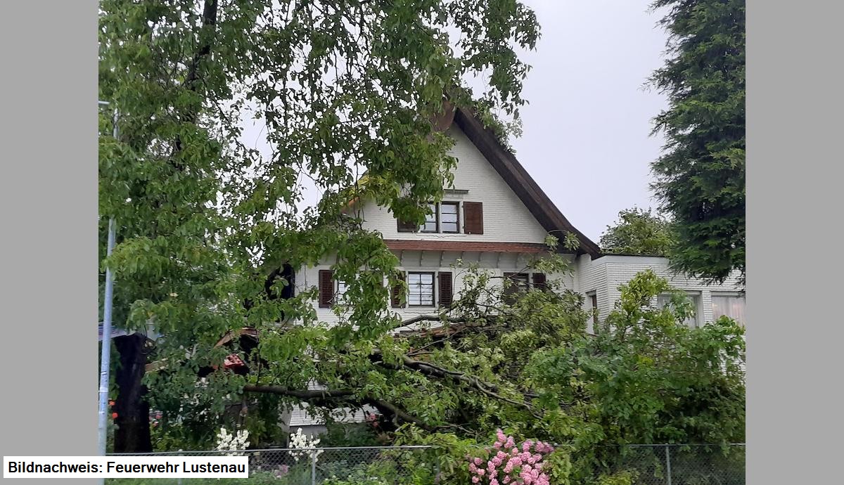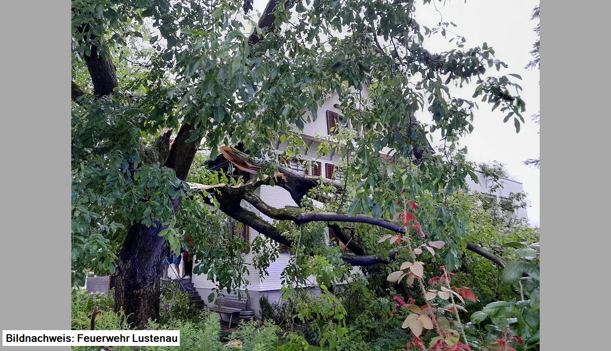 Baum im Haus/Dach angehoben/Vordach abgeschlagen/Fenster durchgeschlagen/Baum liegt noch auf Haus